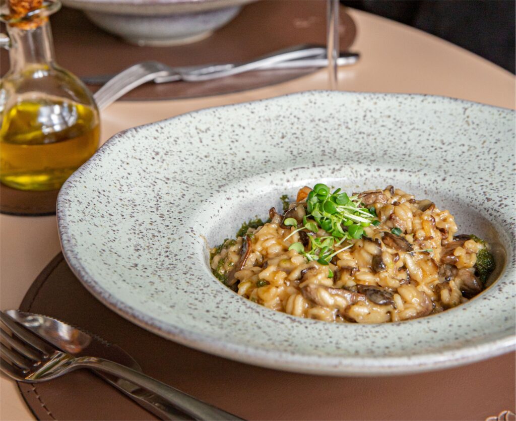 Risoto preparado com caldo de carnes, filé mignon, cogumelos frescos e secos, cebola e alho. Clássico e sempre atual para aqueles que gostam de um risoto com sabor mais intenso. Levemente apimentado!